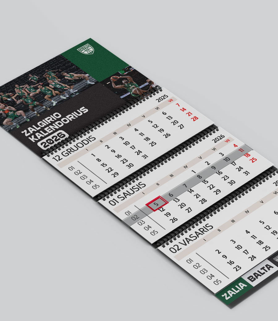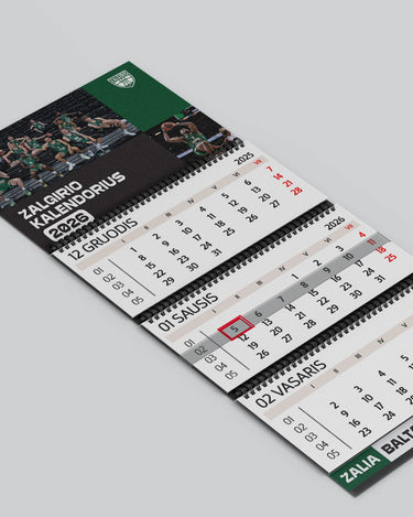 „Žalgirio“ trijų dalių sieninis kalendorius – praktiškas pasirinkimas su aiškiai matomomis datomis ir komandos nuotrauka.