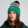 Žaisminga žieminė kepurė, dekoruota dideliu bumbulu ir Žalgirio komandos firminio stiliaus motyvais.