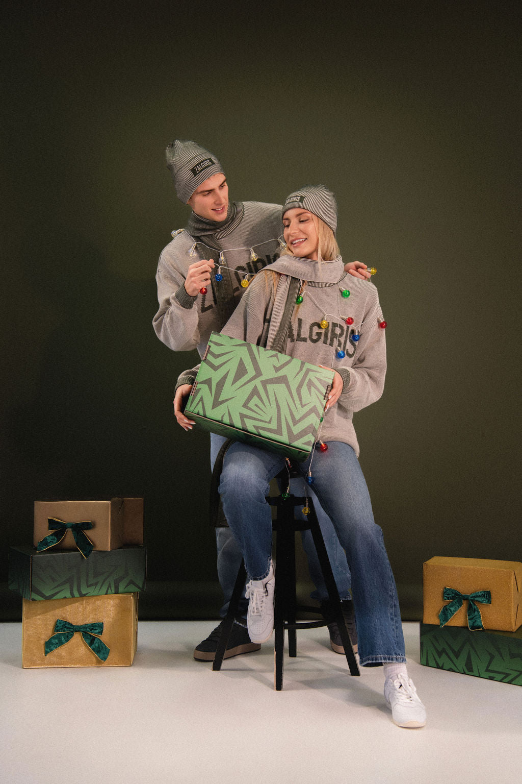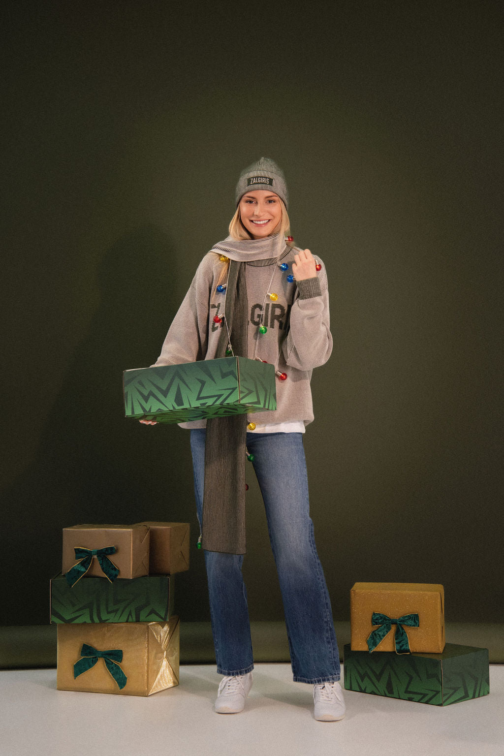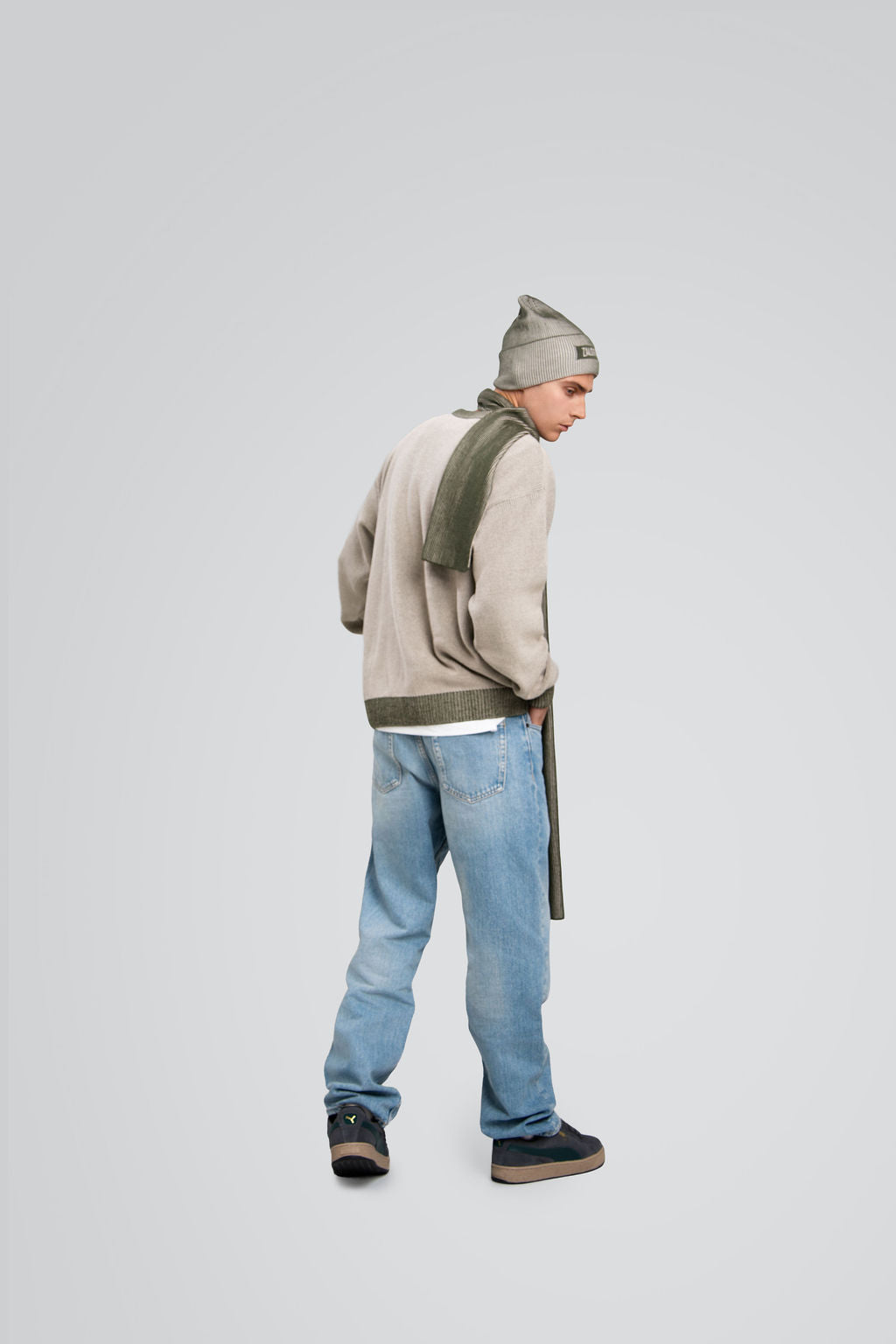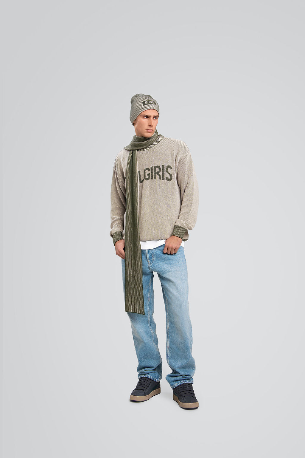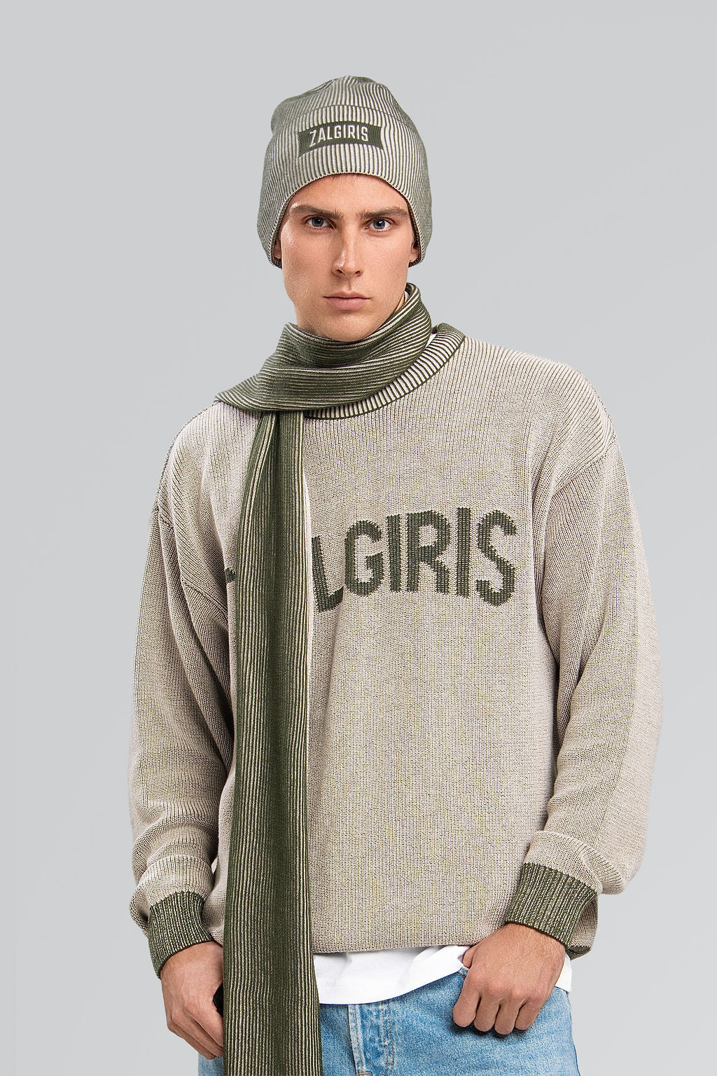 Natūralių, žemės atspalvių megztinis su „Žalgirio“ užrašu.