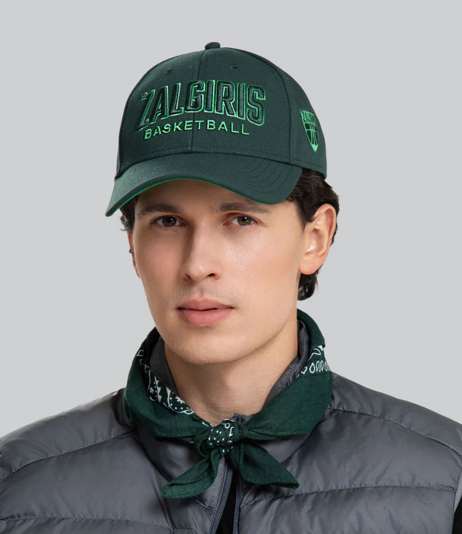 Klasikinė tamsiai žalios spalvos „Žalgirio“ kepurė su išsiuvinėtu išraiškingu „Žalgiris Basketball“ užrašu priekyje. Komandos pavadinimas apvestas šviesiai žaliais kontūrais, kurie dera su žodžio „Basketball“ spalva ir taip suteikia kepurei dar įdomesnį dizainą. Taip pat, drabužio šone subtiliai išdėstytas „Žalgirio“ komandos herbas. Tai minimalistinio stiliaus kepurė, kuri puikiai tiks tiek rungtynėms, tiek pasivaikščiojimams lauke.