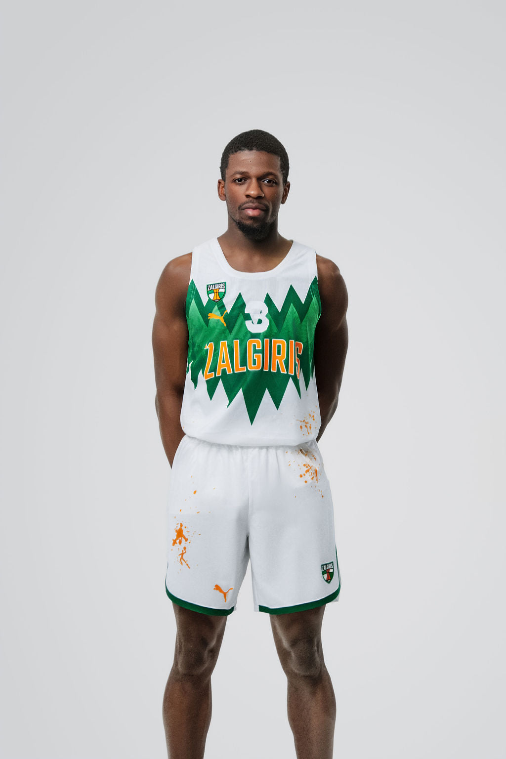 Parduodama apranga nėra analogiška nuotraukose vaizduojamų žaidėjų marškinėliams. Ženklas „Žalgiris“ yra aukščiau bei oranžinės spalvos, nėra Eurolygos logotipo bei žaidėjo pavardės ir/ar skaičiaus.