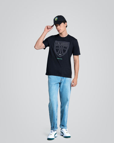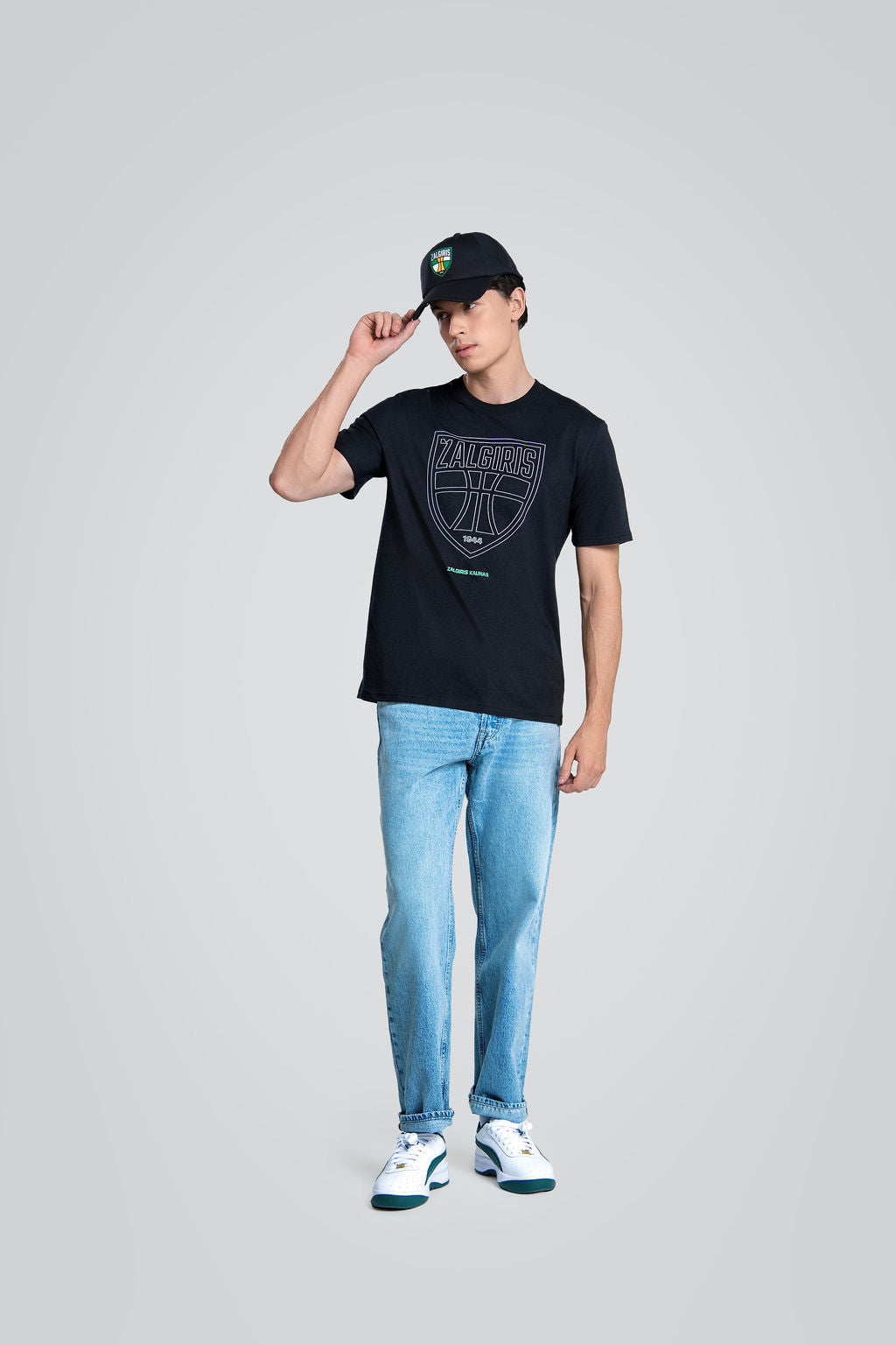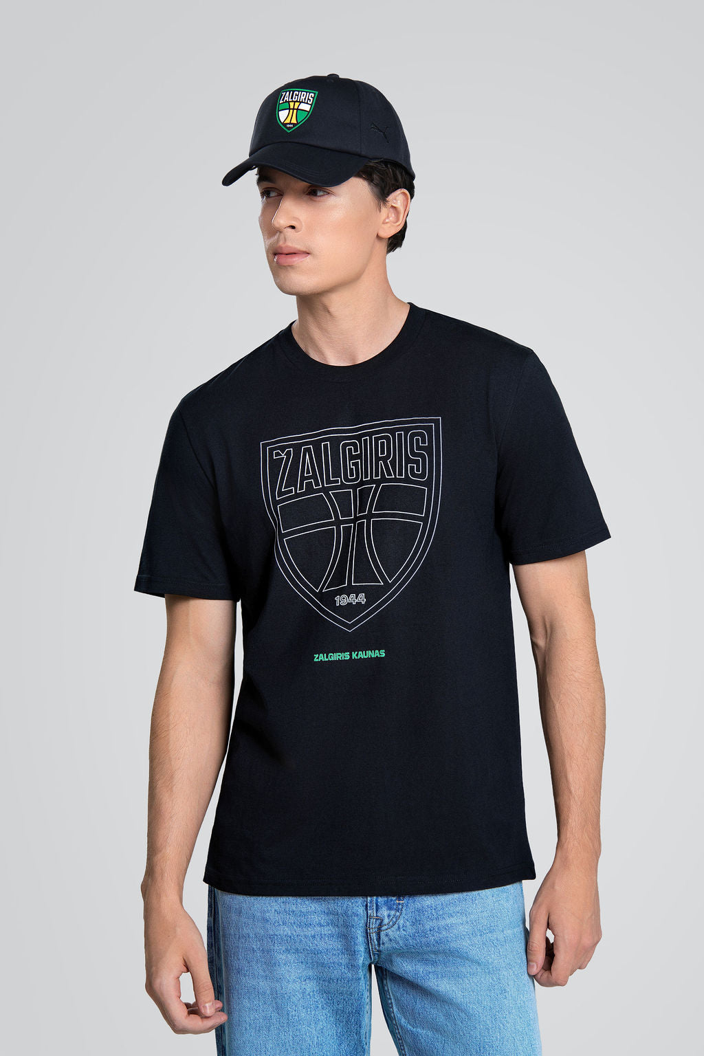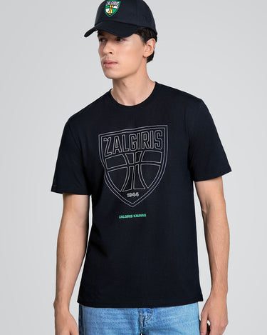 Juodi medvilniniai marškinėliai, dekoruoti su „Žalgirio“ komandos logotipu.
